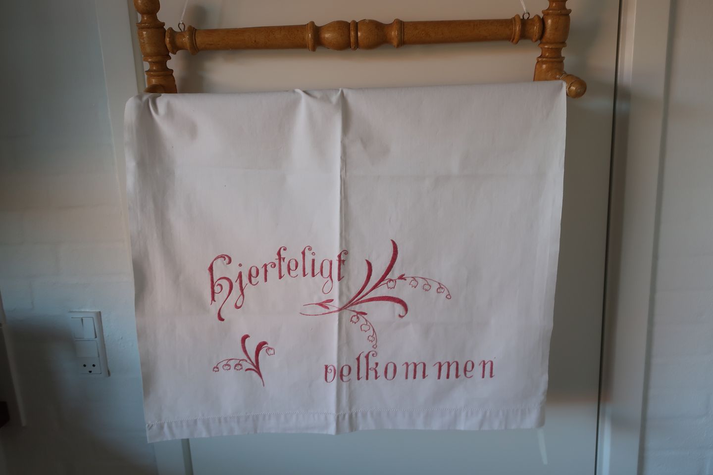 Smukt gammelt paradestykke med rødt håndbroderi