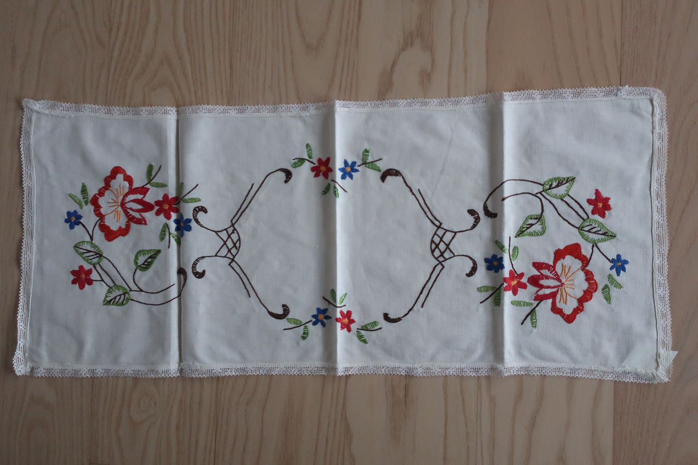 Gammel dug/bordløber Håndbroderet med farvet broderi Ca. 60cm x 30cm God stand Varenr.: LØ11-4-41892