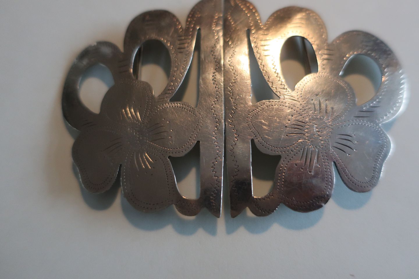 Antikt smukt bæltespænde i ny sølv Meget smukt mønster Stemplet NS og X L: 9,5cm Samlet spænde B: 6,5cm God stand Varenr.: KH7-SM4a+b